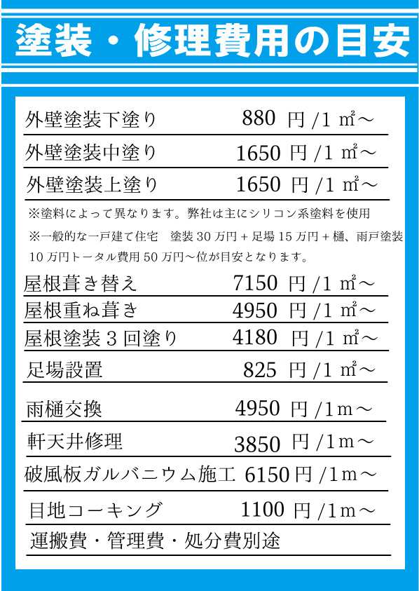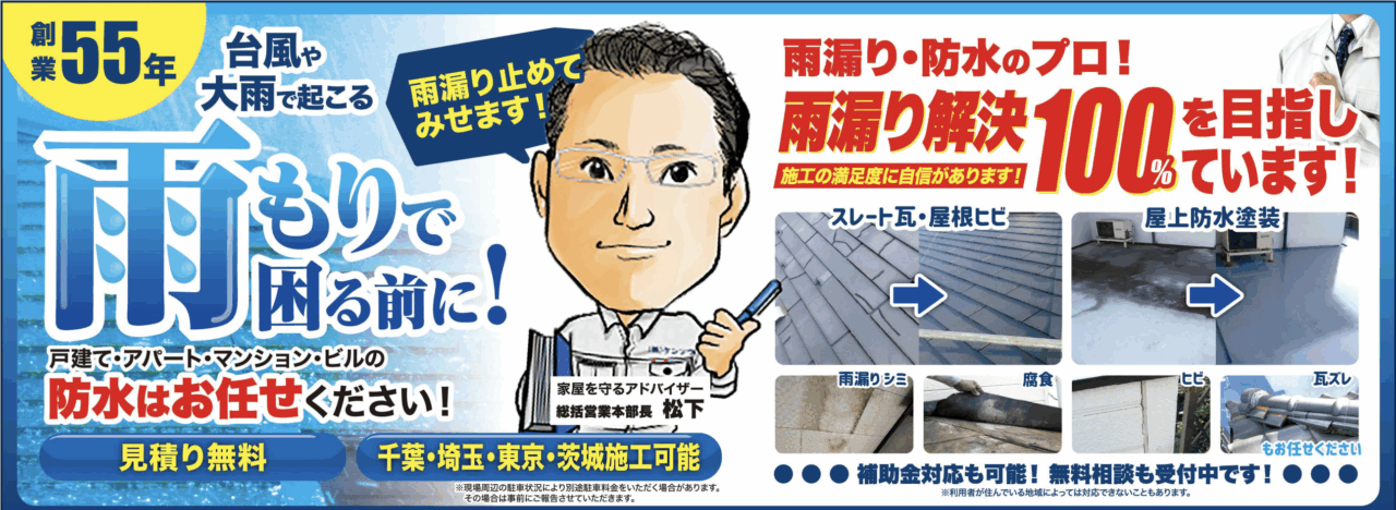 施工実績5,000件以上 あなたの街のリフォーム店 松戸市の外壁塗装 「雨漏り修理行います!」 ★新築から約10年程経過すると、家屋の壁は塗り替え時期になります。★千葉県松戸市にリフォーム会社を創立して55年地元を中心に外壁塗装やリフォーム工事を多数行い、施工実績豊富です。★壁の塗装は足場の設置費用も含め、「費用が高い」とのイメージが御座いますが弊社は地元松戸市を中心にリフォームを行う老舗です。当然安価でありながらも、お値引きなどの交渉にも応じます。★金額面で不安であれば予算をお伝えして頂ければ、その予算内で最大限の施工案を提案いたします!「そろそろ家の壁を塗り替えよう」とお考え中であれば、是非弊社にお任せください! 代表あいさつ SERVICE 株式会社ケンソウのお仕事の内容とは? 仕事内容のご紹介 雨漏り修理 防水塗装 修理とリフォーム 庭木のお手入れ 外壁・エクステリア ユニットバスリフォーム 雨漏り対策のプロ集団です!雨漏りを止めてみせます! お客様の声 ①So邸(千葉県流山市)屋根はリボール社の「超高反射塗料」の遮光塗料を使いました。真夏 帰宅してから、2階に上がっても、モワーッっとする暑さが、全くなくなり、帰宅後、冷房エアコンの利きが早く成ってご機嫌です。全体の外装してから、1年後に、目隠しフェンスもケンソウで取り付けて、とても綺麗で丈夫で、大きな犬を飼っても安心です。壁から侵入していた雨漏りも止めて、安心して住んで行けます! ①Sa邸(千葉県流山市)家を購入して依頼、20年間外装は何も手を付けていなかったが、担当営業(兼任)職人でもあり施工管理責任者でもある松下さんは、とてもわかりやすく素人でも理解できる伝え方をしてくれて、なるほど、なるほどと、とても納得できたし、その優しそうなお人柄に主人も息子も十分に納得して、しかも着工途中の屋根洗浄は、1回目塗装した時と、2回目、3回目の差の写真を都度データや印刷して渡してくれて、安心感が途中でましました。庭の伸びた枝木も特別価格(超格安)でカット剪定してくれてびっくりするほどのきれいな家によみがえってしまいました。 REASON 私たちが選ばれる理由 POINT 01 低価格で安心 出張費・見積は無料! その家に最適でかつ適正な価格帯の修繕を提案致します。 POINT 02 丁寧なプロセスと充実したアフターケア 工程写真をしっかり撮影し、引き渡し後報告書をお渡しします。保証期間は5年間!最大10年間の保証付き! POINT 03 豊富な知識と経験 施工実績多数!雨漏り修繕のプロなど、優秀な職人を抱えており、仕上がりが綺麗です。また、お客様にわかりやすい説明をいたします。 POINT 04 地域密着だからフットワークが軽い! お客様がお困りのときの対応の、柔軟さや迅速さに優れています。 さらに詳しく OTHER その他のメニュー ご利用の流れ よくある質問 WORKS 施工事例 施工事例その① 施工事例その② 施工事例その③ さらに詳しく NEWS 新着情報 松戸市周辺の庭木のお手入れ「剪定」「伐採」 もっと読む 採用情報 もっと読む 外装塗装・防水塗装業務(応援・常用)委託作業員さん募集のお知らせ もっと読む 自宅駐車場のコンクリート施工にかかる費用とポイント もっと読む Load More 一覧を見る 株式会社ケンソウ 千葉県松戸市の地元密着リフォーム専門店! 本 社 :千葉県 白井市 根 1818-13松戸支社:千葉県 松戸市 千駄堀 1470-74◆お問い合わせTEL: 0120-944-760 ※受付時間:平日9時~18時携帯: 080-3388-4761 ※常時対応可能(取れない場合はお掛け直しいたします)FAX: 047-427-3855Mail: info@kensou-group.com 会社概要