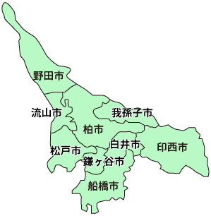 流山市、我孫子市、印西市、野田市、松戸市、白井市、柏市、鎌ヶ谷市、